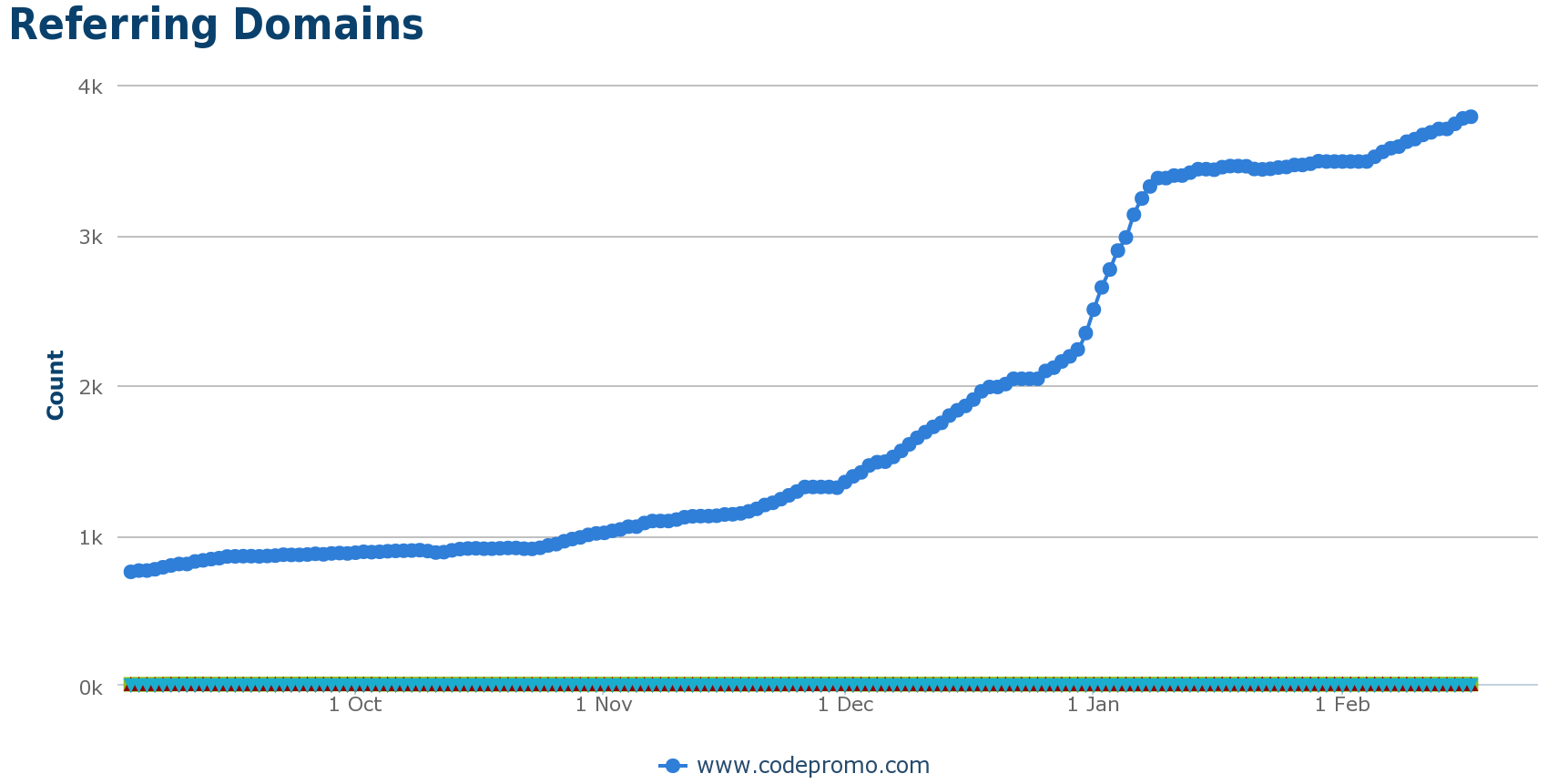 Même s’il manque le début de la courbe, on voit sur le graphique ci-dessus que le nombre de sites qui font un hyperlien vers CodePromo.com est en augmentation dès septembre, avec une forte croissance à compter de la fin octobre.
