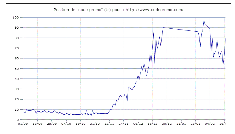 Position de CodePromo.com dans Google : plus c'est bas, plus c'est en début de liste (et donc bien !)
